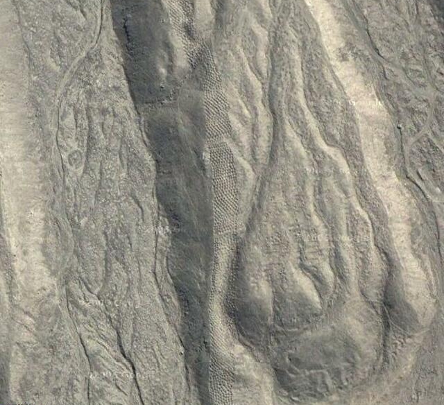 Thousands of man-sized holes are carved into the barren rock near Pisco Valley, Peru on a plain called Cajamarquilla, Maybe for food culture.